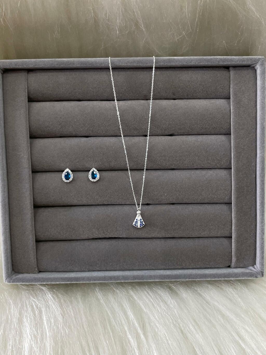 CONJUNTO COLAR NOSSA SENHORA MANTO CRAVEJADO AZUL +BRINCO PREMIUM AZUL BORDA CRAVEJADA